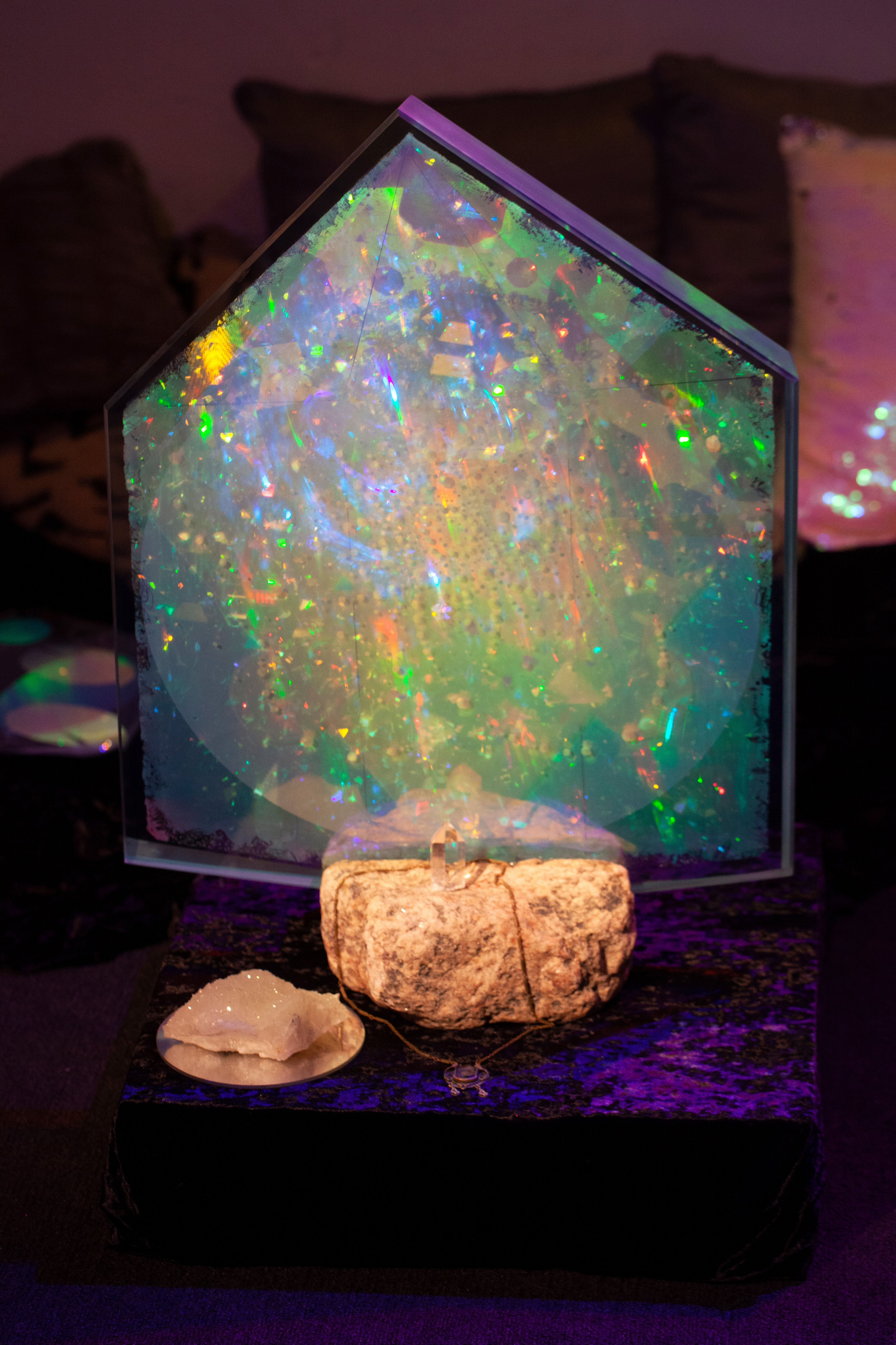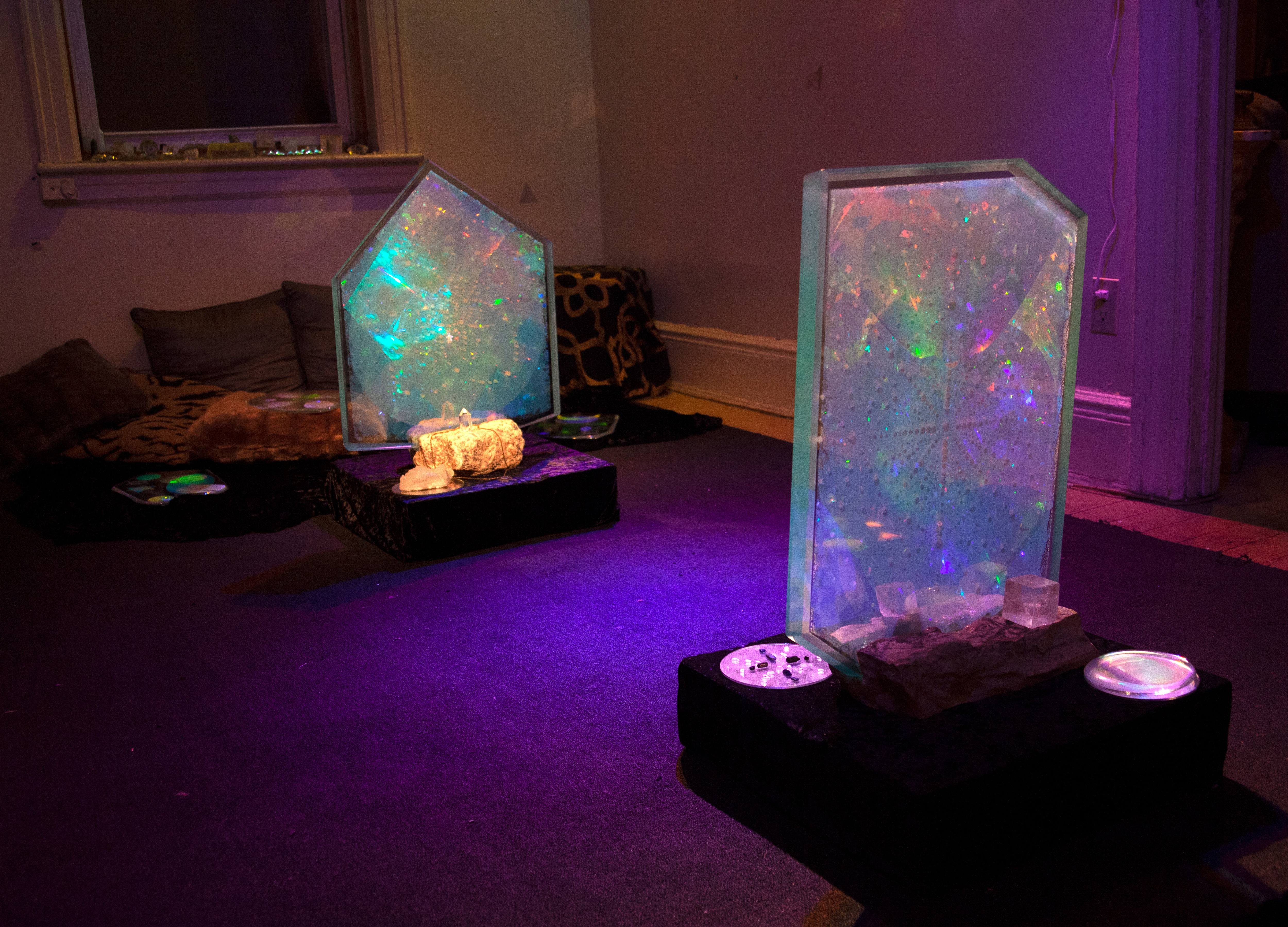 Circle-casting Multilogue – This performance included a circle-casting involving an invocation of light and crystal intelligence as well as a multilogue which invited attendees to relate their own stories and experiences with light. A calling of the corners modified to consider physical optics was recited, followed by the encircling of the gallery, body of work, and participants with a line of mixed crystal gravel containing refuse pieces of black tourmaline, rose quartz, labradorite, clear quartz, and lapis lazuli.